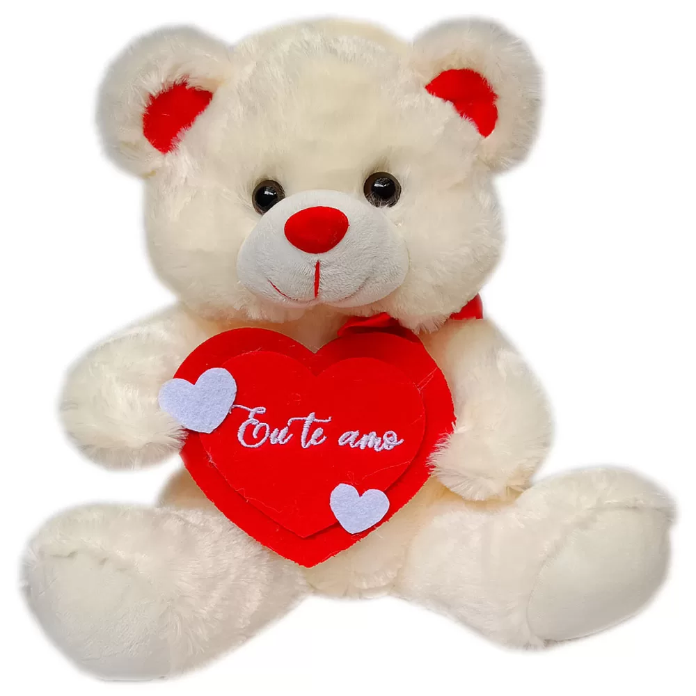 Urso de pelúcia confeccionado com pelúcia super macia e com enchimento em fibra sintética siliconada.